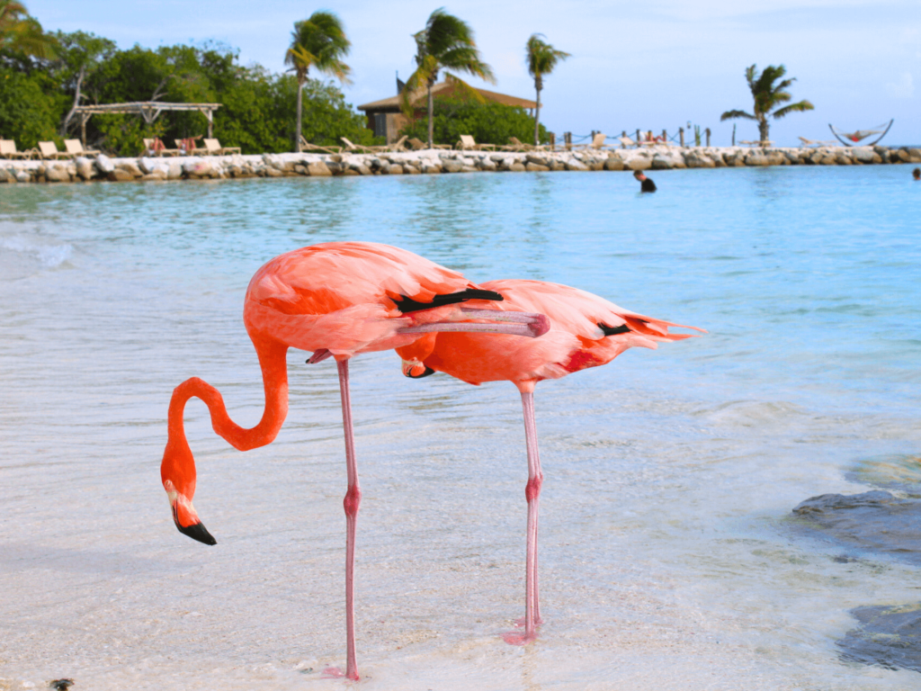 photo of flamingos in front of a cabana in aruba by elicit folio